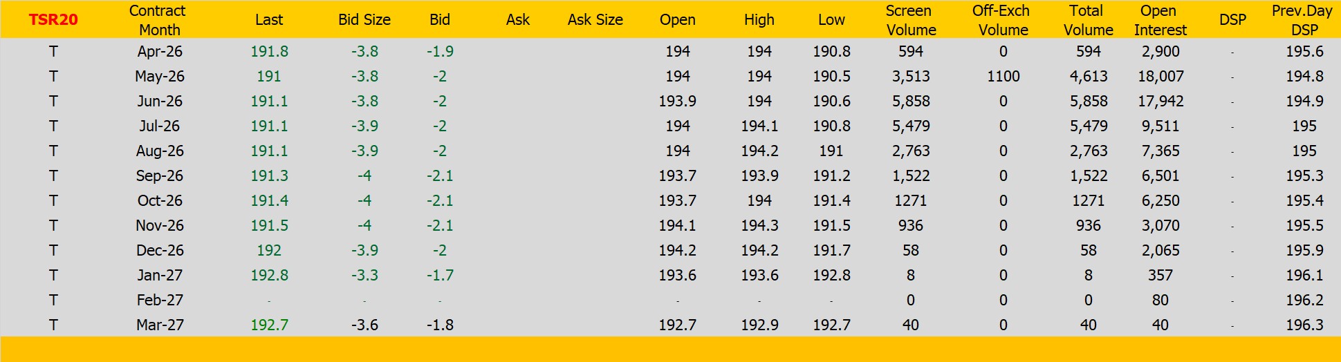 ราคายางTSR20 ตลาดยางSICOM ราคาส่งมอบเดือน เม.ย.ปิดที่191.8 เซนต์สหรัฐ ราคาลดลง -3.8 เซนต์สหรัฐหรือ คิดเป็นเปอร์เซนต์ -1.94% %