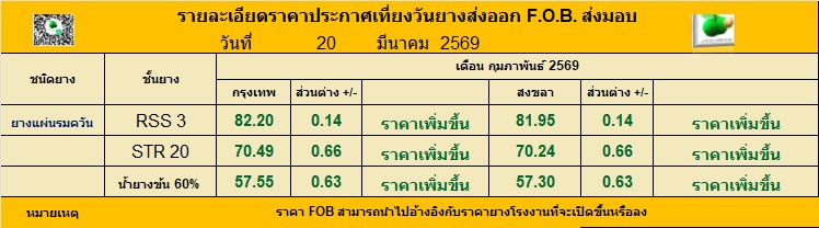 รายละเอียดราคาประกาศเที่ยงวันยางส่งออก F.O.B. ส่งมอบ ประจำวัน ศุกร์ ที่ 20 มีนาคม 2569