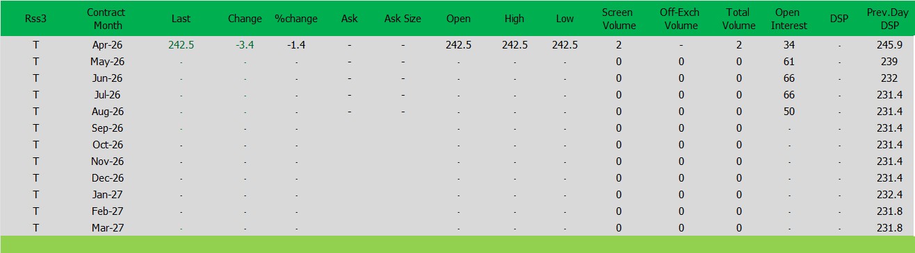 ราคายางRSS3 ตลาดยางSICOM ราคาส่งมอบเดือน เม.ย.ปิดที่242.5 เซนต์สหรัฐ ราคาลดลง -3.4 เซนต์สหรัฐหรือ คิดเป็นเปอร์เซนต์ -1.38% %