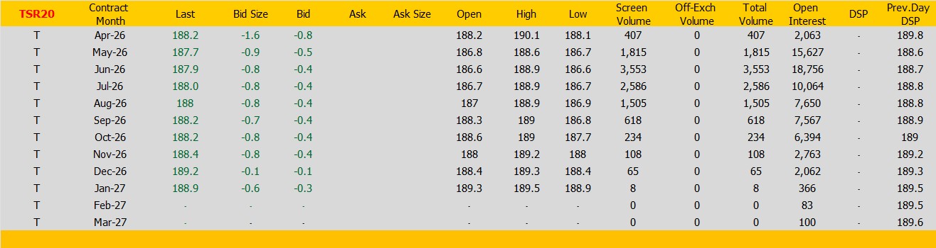 ราคายางTSR20 ตลาดยางSICOM ราคาส่งมอบเดือน เม.ย.ปิดที่188.2 เซนต์สหรัฐ ราคาลดลง -1.6 เซนต์สหรัฐหรือ คิดเป็นเปอร์เซนต์ -0.84% %