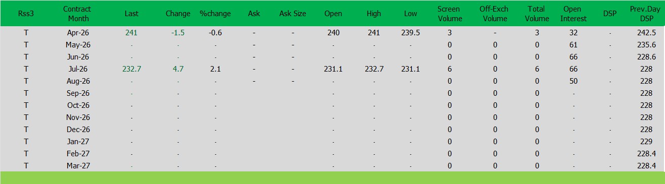 ราคาปิดตลาดยาง SICOMประจำวัน จันทร์ ที่ 23มีนาคม2569ราคายาง RSS3 ราคาเดือนเม.ย. ราคาลดลง -1.5เซนต์สหรัฐ ปิดที่ 241 เซนต์สหรัฐ