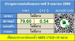 ส่วนราคาเฉลี่ยยางแผ่นดิบคุณภาพดีวันนี้ 79.60 บาท/กก. ราคาเฉลี่ยเพิ่มขึ้น 5.99 บาท/กก. จากวันก่อนหน้านี้