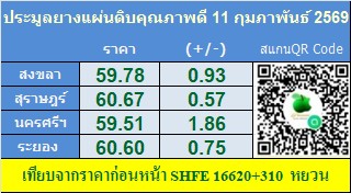 ราคาประมูลแผ่นดิบ : ตลาดสงขลา 59.78 บาท/กก. ราคาเพิ่มขึ้น 0.93บาท/กก. ปริมาณยาง 314 กก.