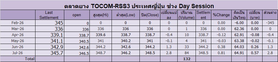ราคาปิดตลาด TOCOM-RSS3 ช่วง Day Session ประจำวัน พุธ ที่ 18 กุมภาพันธ์ 2569ก.ค.-2026 เพิ่มขึ้น 2.8เยน Settle อยู่ที่ 348.50เยน ปริมาณ 84 สัญญา