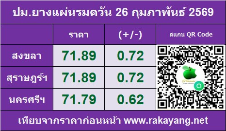 ราคาประมูลแผ่นรมควัน: ตลาดสงขลา 71.89001 บาท/กก. ราคาเพิ่มขึ้น 0.72 บาท/กก. ปริมาณยาง 77,271 กก.