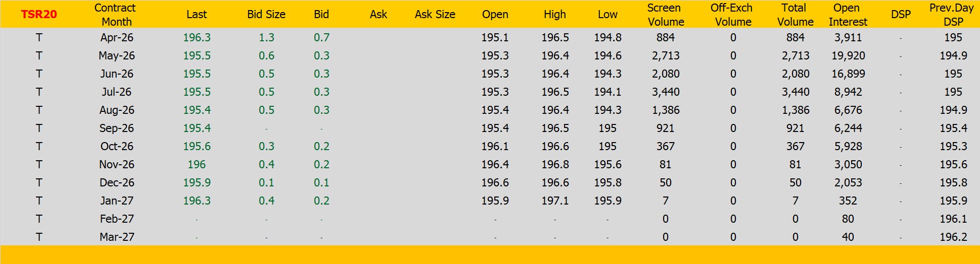 ราคายางTSR20 ตลาดยางSICOM ราคาส่งมอบเดือน เม.ย.ปิดที่196.3 เซนต์สหรัฐ ราคาเพิ่มขึ้น 1.3 เซนต์สหรัฐหรือ คิดเป็นเปอร์เซนต์ +0.67% %