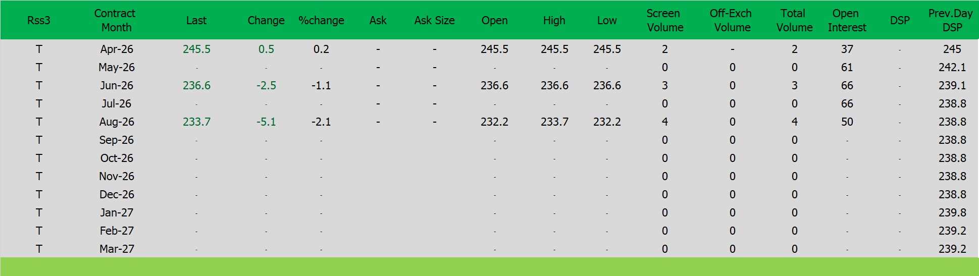 ราคายางRSS3 ตลาดยางSICOM ราคาส่งมอบเดือน เม.ย.ปิดที่245.5 เซนต์สหรัฐ ราคาเพิ่มขึ้น 0.5 เซนต์สหรัฐหรือ คิดเป็นเปอร์เซนต์ +0.20% %