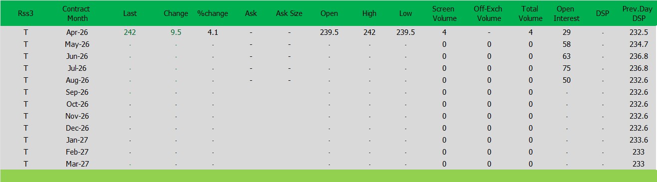 ราคายางRSS3 ตลาดยางSICOM ราคาส่งมอบเดือน เม.ย.ปิดที่242 เซนต์สหรัฐ ราคาเพิ่มขึ้น 9.5 เซนต์สหรัฐหรือ คิดเป็นเปอร์เซนต์ +4.09% %