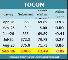 ราคาปิดตลาด TOCOM-RSS3 ช่วง Day Session ประจำวัน อังคาร ที่ 31 มีนาคม 2569ก.ย.-2026 ลดลง -0.1เยน Settle อยู่ที่ 380.60เยน ปริมาณ 358 สัญญา