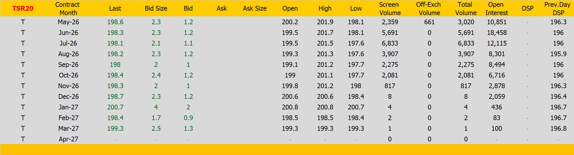 ราคายางTSR20 ตลาดยางSICOM ราคาส่งมอบเดือน เม.ย.ปิดที่198.6 เซนต์สหรัฐ ราคาเพิ่มขึ้น 2.3 เซนต์สหรัฐหรือ คิดเป็นเปอร์เซนต์ +1.17% %