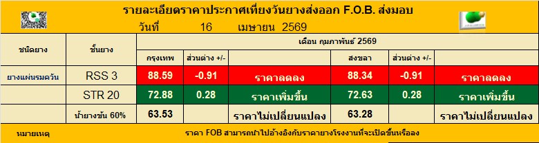 รายละเอียดราคาประกาศเที่ยงวันยางส่งออก F.O.B. ส่งมอบ ประจำวัน พฤหัสฯ ที่ 16 เมษายน 2569