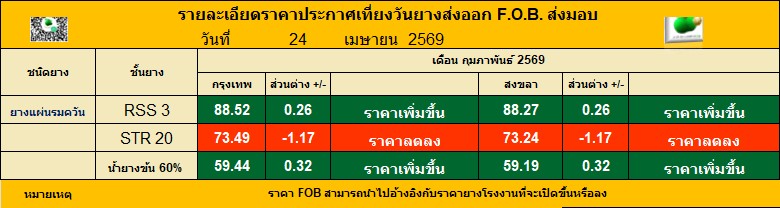 รายละเอียดราคาประกาศเที่ยงวันยางส่งออก F.O.B. ส่งมอบ ประจำวัน ศุกร์ ที่ 24 เมษายน 2569