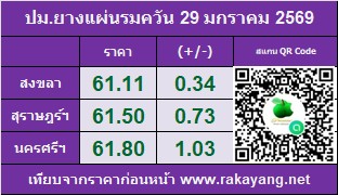 ราคาประมูลแผ่นรมควัน: ตลาดสงขลา 61.11 บาท/กก. ราคาเพิ่มขึ้น 0.34 บาท/กก. ปริมาณยาง 116,308 กก.
