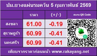 ราคาประมูลแผ่นรมควัน: ตลาดสงขลา 61 บาท/กก. ราคาลดลง -0.19 บาท/กก. ปริมาณยาง 104,823 กก.
