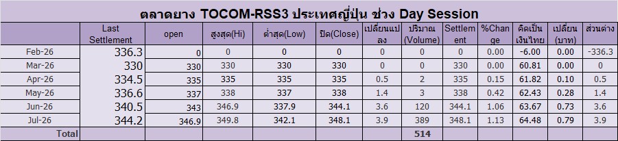 ราคาปิดตลาด TOCOM-RSS3 ช่วง Day Session ประจำวัน พฤหัสฯ ที่ 5 กุมภาพันธ์ 2569ก.ค.-2026 เพิ่มขึ้น 3.9เยน Settle อยู่ที่ 348.10เยน ปริมาณ 389 สัญญา