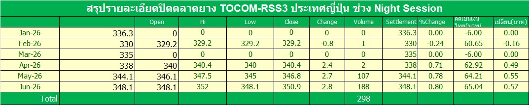 TOCOM-RSS3 ปิดตลาดช่วง Night Session ประจำวัน พฤหัสฯ ที่ 5 กุมภาพันธ์ 2569 ราคาเดือน มิ.ย.-2026ปิดตลาดที่ 350.90 เพิ่มขึ้น 2.8เยน ปริมาณ 188 สัญญา