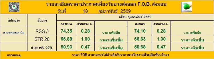 F.O.B Bangkok Price(18/2)Mar.26 RSS3=THB74.35(+0.28)USD=2.38 STR20=THB66.88(+1.00)USD=2.14 Latex60%=THB50.93(+0.47)USD=1.63(Exchange rate=31.19Baht/1Dollar)