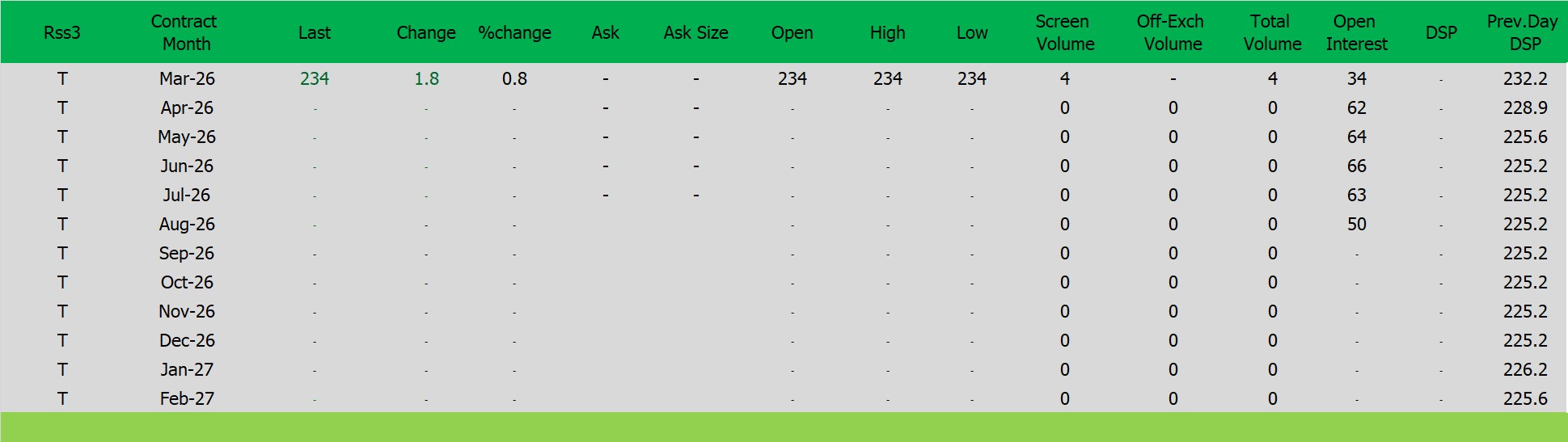 TSR20Contract MonthLastBid SizeBidAskAsk SizeOpenHighLowScreen VolumeOff-Exch VolumeTotal VolumeOpen InterestDSPPrev.Day DSP