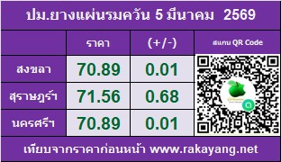 ราคาประมูลแผ่นรมควัน: ตลาดสงขลา 70.89 บาท/กก. ราคาเพิ่มขึ้น 0.01 บาท/กก. ปริมาณยาง 110,219 กก.